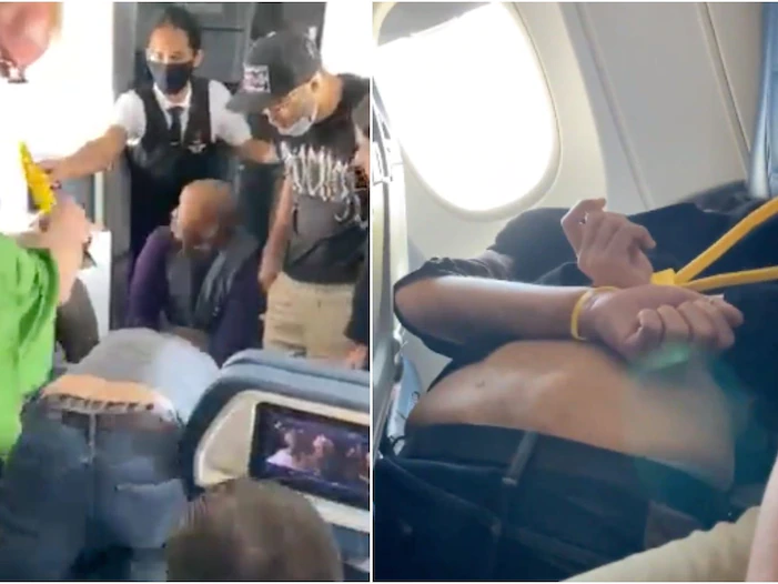 Videos show that a passenger was restrained and had his wrists zip-tied on a Delta flight to Nashville on June 4, 2021. Twitter: @1WaySuggs, @Jesscribe
